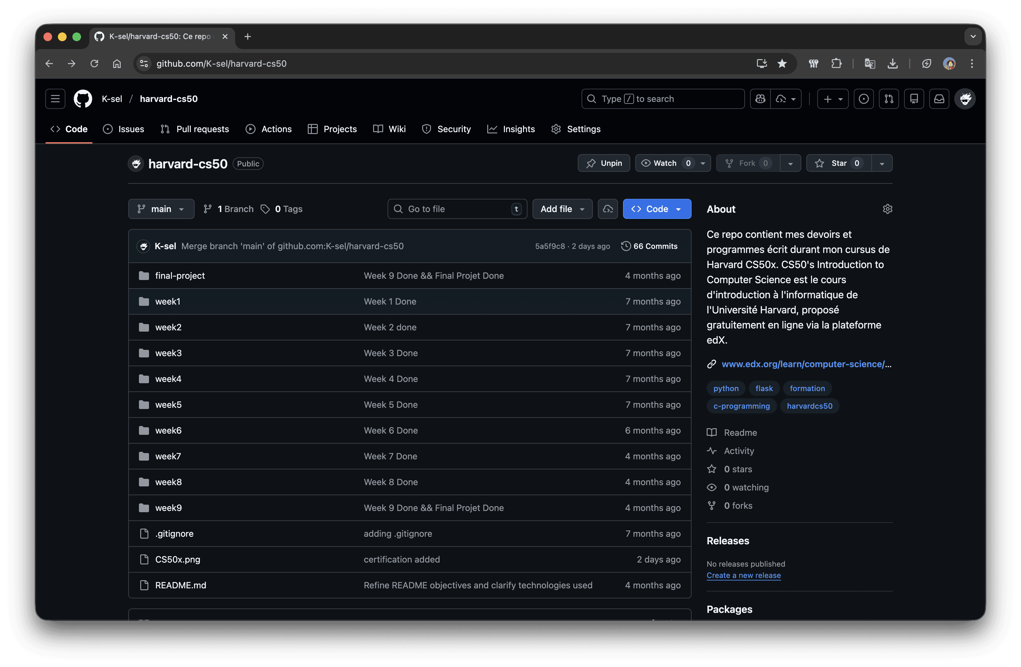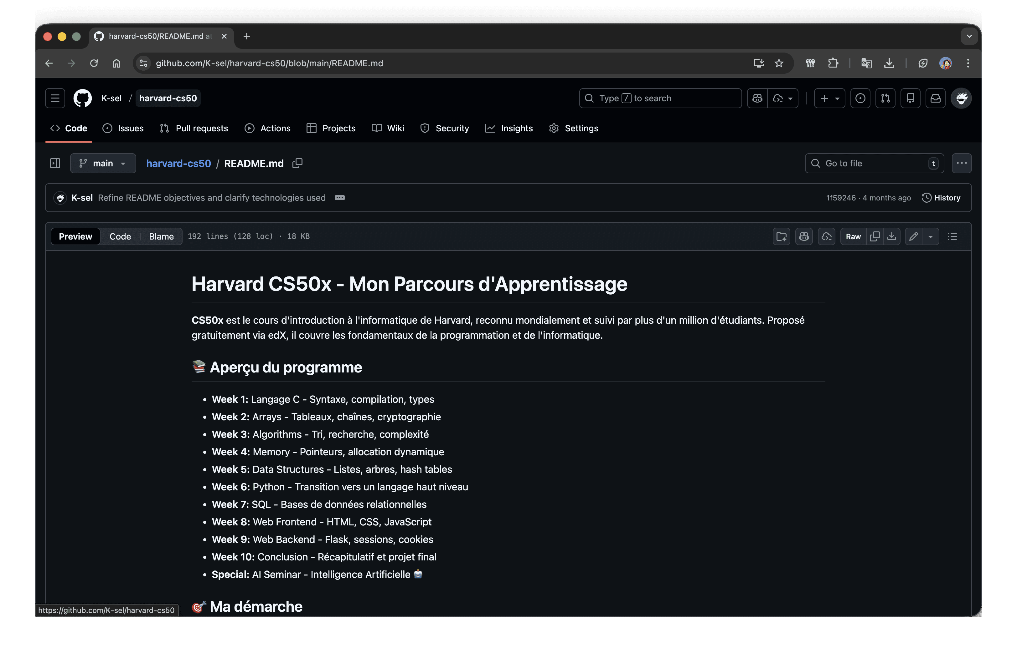 CS50x de Harvard : le cours d'introduction à l'informatique le plus reconnu au monde, suivi par plus d'un million d'étudiants. Une formation complète que j'ai entreprise en autodidacte, en parallèle de mes études, pour renforcer mes bases et découvrir des langages absents de mon cursus.