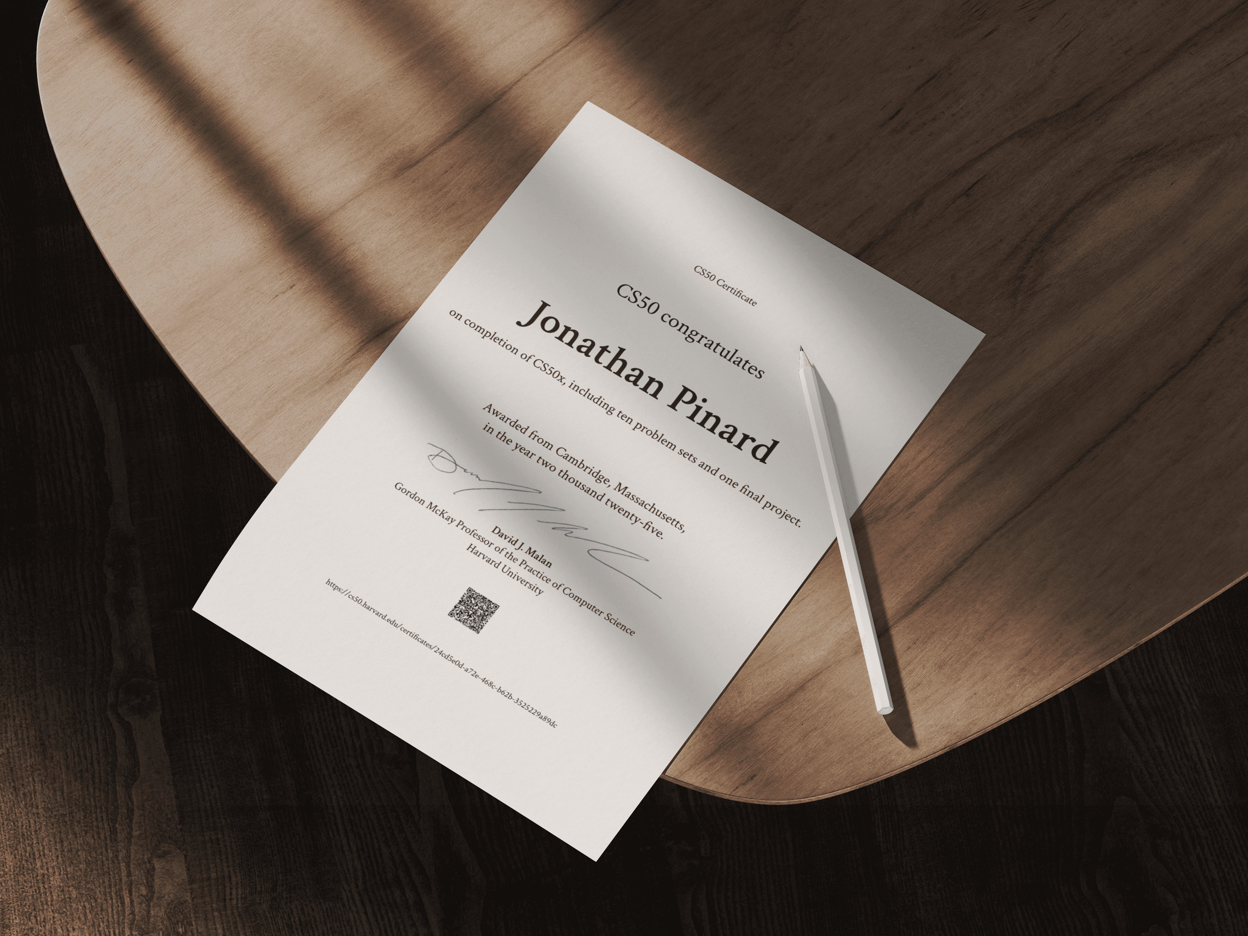 CS50 m'a donné des bases solides en programmation bas niveau avec le C — pointeurs, allocation mémoire, structures de données — des concepts que mon bachelor n'aborde pas. J'ai développé une pensée algorithmique rigoureuse et appris à transférer mes connaissances d'un langage à l'autre. Cette formation valide ma capacité à apprendre en autonomie au plus haut niveau académique, et prouve que curiosité et discipline ouvrent toutes les portes.