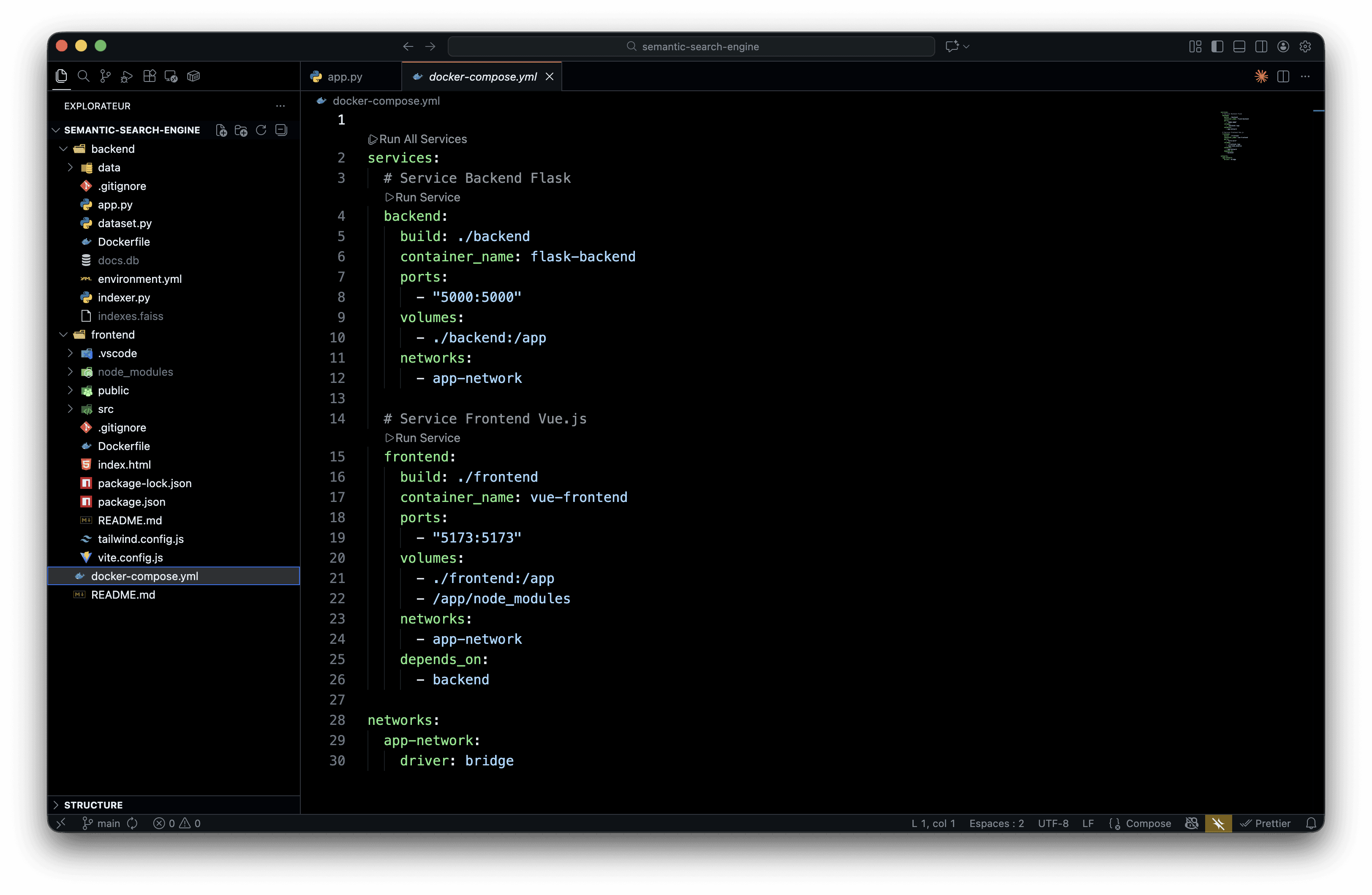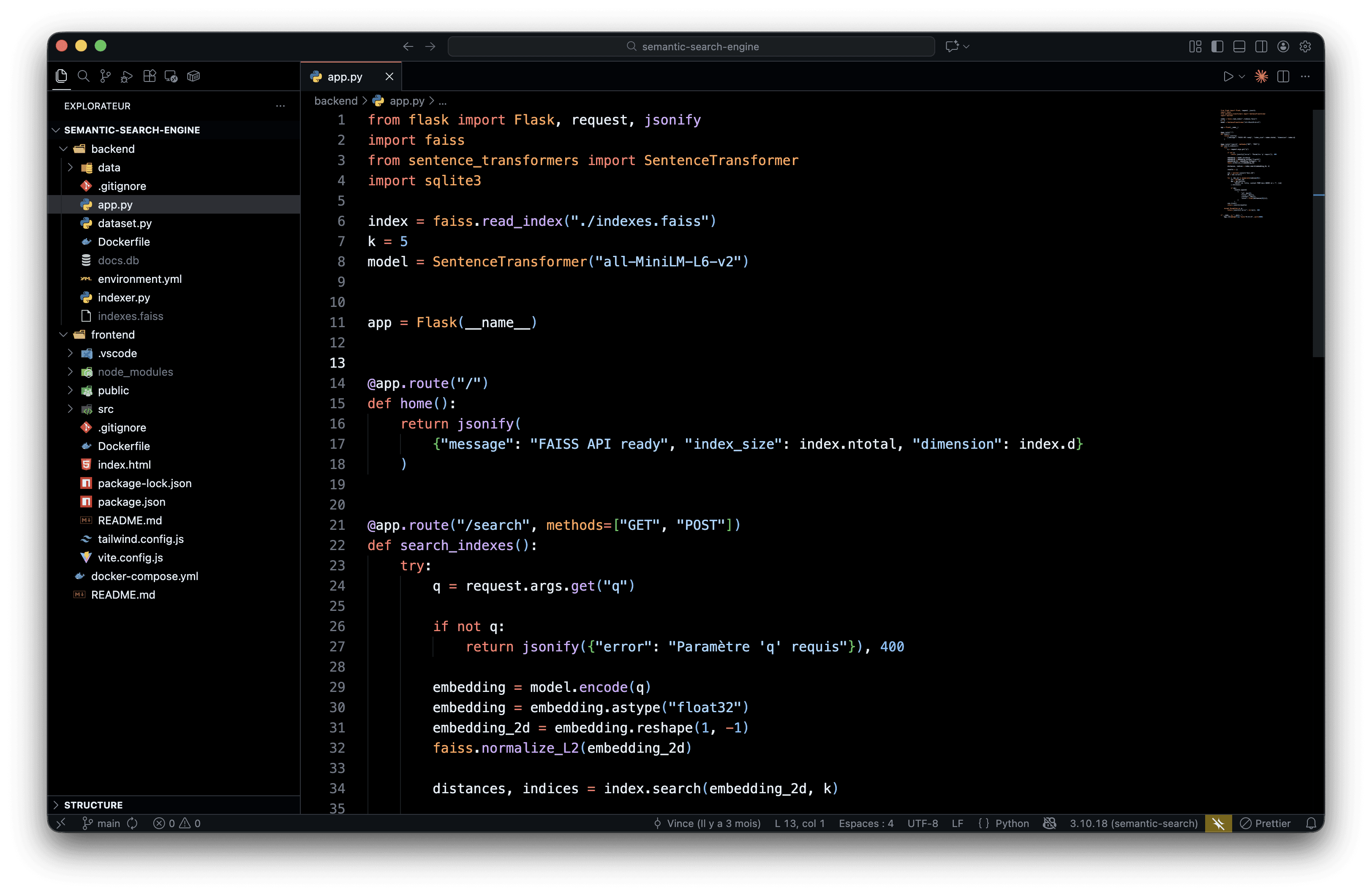 Contrairement à une recherche classique par mots-clés, ce moteur utilise des embeddings vectoriels pour capturer le sens du texte. Chercher "voiture rapide" trouvera aussi "automobile sportive" ou "véhicule performant". Le cœur du système repose sur les embeddings générés par Sentence Transformers : chaque document est converti en un vecteur de 384 dimensions capturant son sens sémantique. FAISS, la bibliothèque de Facebook AI Research, permet ensuite d'effectuer des recherches de similarité ultra-rapides, avec des temps de réponse de quelques millisecondes. L'application suit une architecture microservices orchestrée par Docker Compose : backend Flask pour l'API REST et l'indexation, frontend Vue.js avec Vite pour l'interface. La communication entre services se fait via un réseau Docker privé avec proxy Vite pour rediriger les appels API.